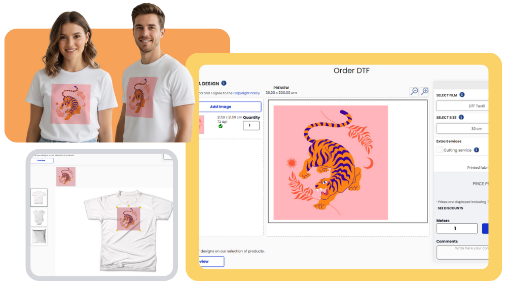 Sube tu hoja de DTF ya montada, revisa el precio y confirma el pedido en un momento.