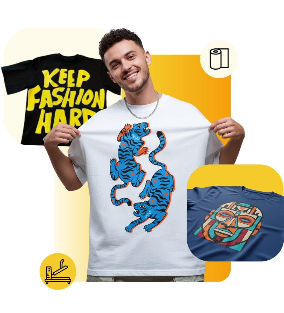 Encarga online tu transfer textil DTF, sube tus diseños al configurador y recibe tus hojas listas para planchar en menos de 48 horas, con calidad certificada y producción en Barcelona.