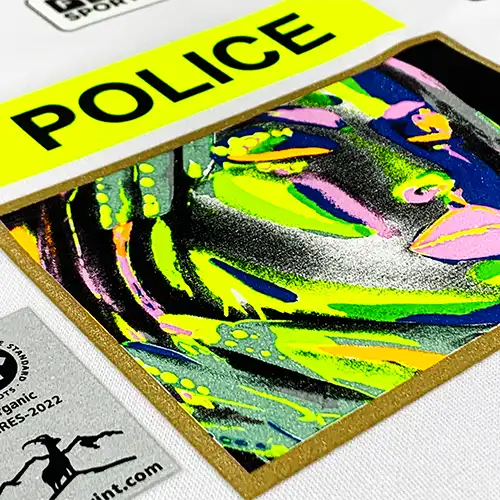 Transfer textil DTF premium con fórmula propia, tacto suave y elástico, colores muy vivos y alta definición.